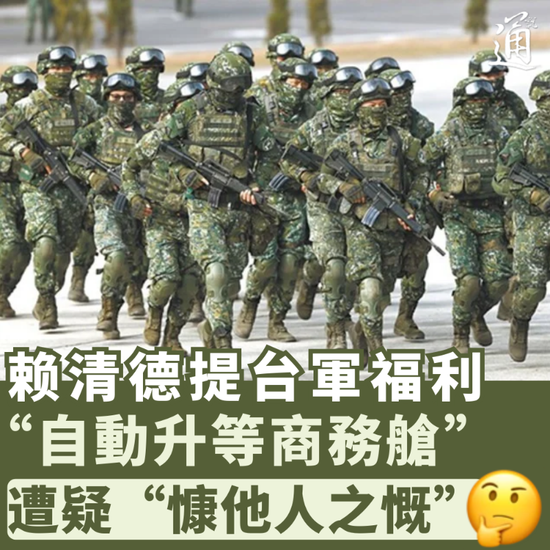 (香港新聞網製圖) 在以防務為主題的第四講中,賴清德聲稱,台軍是為台灣生存發展而戰、為台灣百姓安全福祉而戰,並強調台軍不分先來後到、不分義務或志願役,都是為了保護台灣,呼籲民眾都該成為台軍的後盾。 他宣稱,今年7月起,6家台籍國際線航班將提供“軍人優先登機”服務;他也將請交通主管部門負責人接洽,未來在軍人登機之後,如果發現飛機商務艙仍有空位,應該要自動升等,這樣才是尊重。 賴清德聲稱,當局持續提升台軍待遇與福利,包括提高志願役與戰鬥部隊加給。 賴清德的提議隨即引起外界熱議,被質疑口惠而實不至,因為要真正落實起來並不容易。 台灣網紅“蓋瑞哥”在社交平台臉書粉絲專頁“蓋瑞哥 機票獵人”發文認為,優先登機影響不大,但自動升等,“實務上操作有困難”。一方面應考慮到商務艙空位有限,“升等是否也要看軍階”;另一方面,“機上有航空公司自家會員跟軍人的話,誰的升等順序比較前面呢?” 在該帖文下方的評論區,不少網友亦發出同樣的質疑聲,直言“沒有軍眷一起(升等)根本就是無效政策”。