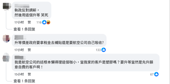 網友評論 此外,網友們還關注升等價差是否由當局補貼,質疑若要“強制升等”、由航空公司自己承擔成本,那分明是“我請客你出錢的概念,慷他人之慨”。 還有網友表示,其他國家和地區軍人因公出差才能獲得乘機升等,而且是由單位報銷,不能強迫航空公司出錢,畢竟“(商務艙和經濟艙)票價差很多倍,航空公司自行吸收會慘賠吧!”