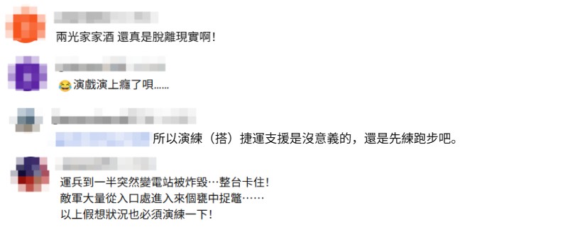 台灣媒體亦指出,該演練科目有諸多可能風險待探討解決,例如城市電力系統遭癱瘓等高壓情境下,捷運系統能否持續發揮戰術功能有待商榷。 因此,島內輿論吐槽,這個演練科目脫離現實,簡直“異想天開”,並指出台軍演習就是“演戲”。網友建議,台軍與其演練搭捷運,不如練跑步,或者把捷運停運被甕中抓鱉的情形也演練一下。
