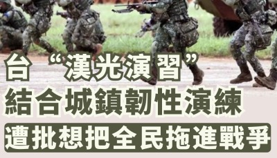 新華澳報:美軍摻和台灣“漢光”演習背景並不尋常香港新聞網7月15日電 《新華澳報》7月15日發文指出,為期十天九夜的台灣當局“漢光41號”演習實兵操演,已經進入尾聲。這場號稱史上最長,並創下後備動員人數最多紀錄的“漢光演習”,被國台辦指斥為妄圖“以武謀獨”、“備戰謀獨”的軍事演習,並警告說無論搞多少演練,都阻擋不了“祖國必然統一”的歷史大勢。實際上,這場軍事演習,是對賴清德設立“全社會防衛韌性委員會”,及將大陸定義為“境外敵對勢力”並推出“十七條因應措施”後的一次綜合性實戰演練,其要將平民捲入“台獨戰爭”的意圖十分明顯,尤其是其中的“城鎮韌性演習”科目,竟然將超市作為避難所,並在三十分鐘防空警報解除後,接續在台北市、台中市、台南市等三個城市,由地方政府及民防團隊實施演習。