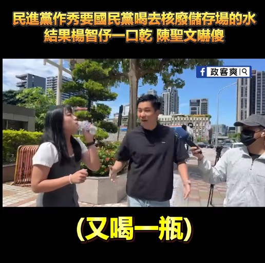 香港新聞網8月20日電 重啟台灣第三核電廠“公投”將於8月23日舉行,民進黨台北市黨部前副執行長陳聖文18日聲稱,要將支持核三重啟的藍白大咖送給選民的礦泉水,帶去蘭嶼的核廢料儲存場,他今日(20日)將水送往中國國民黨中央黨部,嗆藍營應身體力行把水喝下去。豈料,國民黨發言人楊智伃收下水,當場在鏡頭前喝下,並諷刺他不要只會作秀,引發關注及熱議。對此,台灣輿論指出,民進黨從反核臉書貼文被日媒記者打臉,到今天陳聖文意圖販賣核能恐懼一連串動作來看,都證明了民進黨反核論述早偏離事實,只剩下洗腦情勒的反核。 陳聖文今天上午現身國民黨中央黨部送水,還找媒體來拍。他宣稱,國民黨民意代表多數都是嘴巴上說支持核能,身體力行都在反核。豈料,國民黨發言人楊智伃收下水,當場喝下,她強調核能是可以科學理性討論的,而不是操弄情緒來作秀。