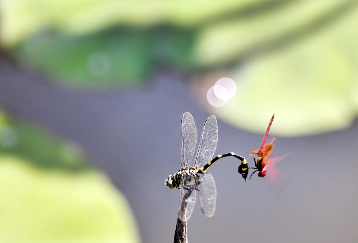 雖然荷花池裡到處都有可以停棲的點,但蜻蜓還是會爭相佔地盤。這個位置顯然是個熱點,粗鉤春蜓停妥了,但紫紅蜻蜓錯把粗鉤春蜓的腹部當成“蜓”機坪,停上去的結果就是被甩下去啦!