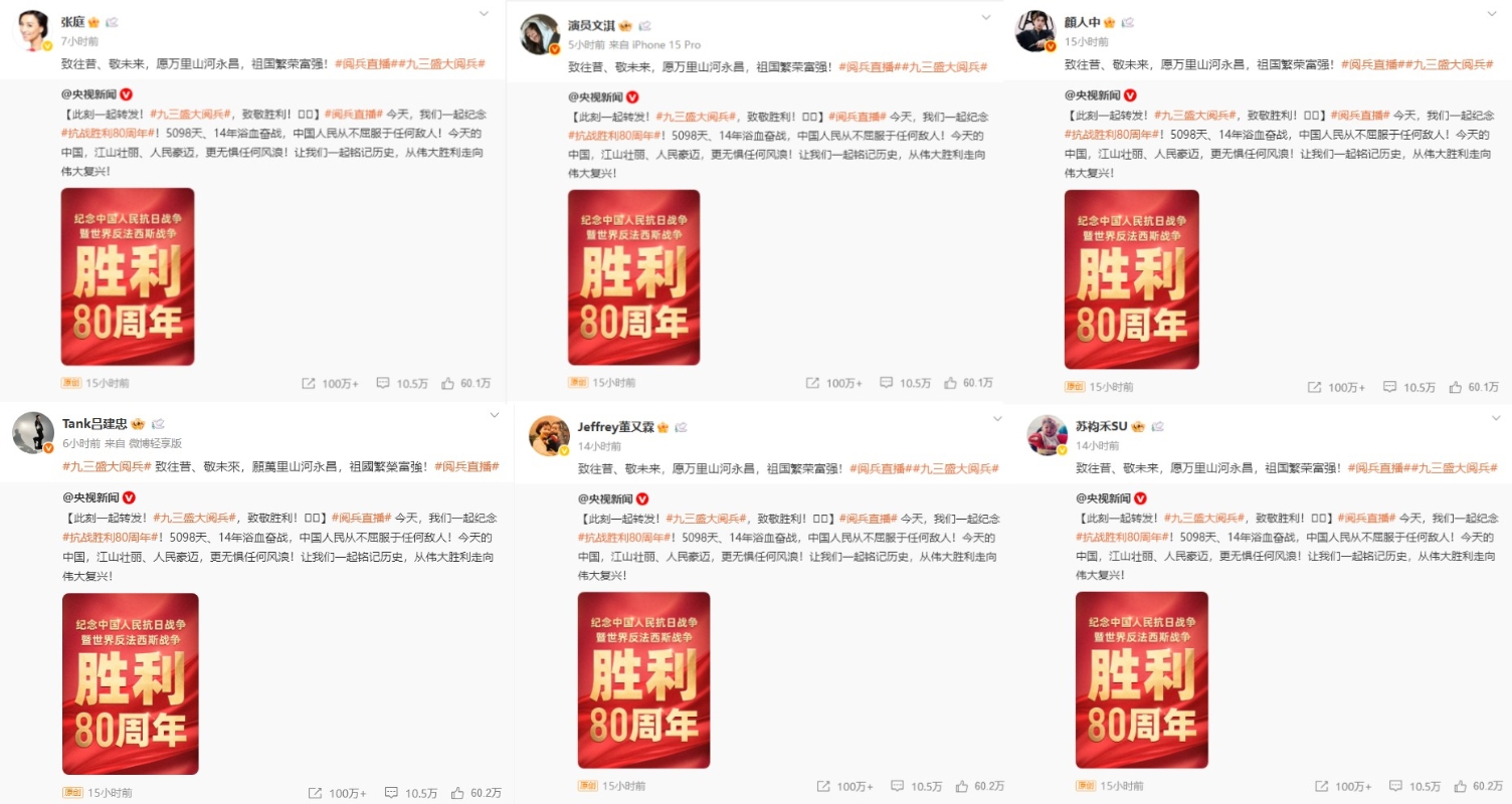 伊能靜表示:“珍惜來之不易的和平!” 吳慷仁表示:“銘記歷史、緬懷先烈、真愛和平、開創未來!” 林瑞陽則高喊:“一起見證九三盛大閱兵!正義必勝!和平必勝!人民必勝!”