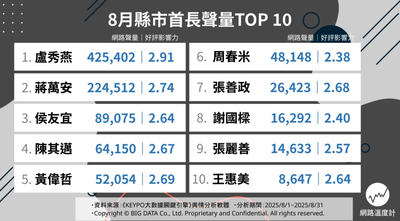 全台縣市首長網絡聲量排名。台媒截圖 綜觀8月,除了台美關稅、行政團隊改組以及“大罷免”與“公投案”,大家還關注國民黨未來可能黨主席人選,這些上榜縣市長聲量和這些政治議題高度聯動。 盧秀燕8月的聲量高峰主要來自兩個事件。8月7日,民進黨立委王義川在政論節目上公然抨擊盧秀燕使用的粉底液,引發性別與外貌歧視爭議。8月24日,盧秀燕宣布不參選國民黨主席,強調要專注市政,獲得正面回響。 分析指出,盧秀燕在兩波大規模罷免中,成功協助台中7位藍營立委保住席次,並跨縣市援助其他遭罷免立委,展現“母雞帶小雞”的政治實力。此外,她雖被國民黨主席朱立倫多次點名參選黨主席,最終選擇留守台中市,反而獲得支持者肯定。 在其他縣市長方面,侯友宜則因回應新北市議會民進黨團提出的“普發4.6萬現金”提案,表示市府財政困窘而引發熱議。台北市長蔣萬安多次就關稅談判、人事改組等議題對民進黨當局提出批評,獲得不少網友支持。(完) 【編輯:淩玉輝】