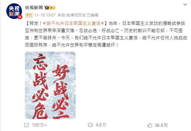 香港新聞網11月20日電 日本首相高市早苗近日在國會公然宣稱“台灣有事”可能構成日本行使所謂“集體自衛權”的“存亡危機事態”,暗示可能武力介入台海問題,引發包括台灣同胞在內的兩岸中國人極大憤慨。官媒央視18日發布“絕不允許日本軍國主義復活”的帖文,獲得大批網友轉發,當中也包括數名台灣藝人。 針對高市早苗錯誤言論,央視18日在社交平台微博發布帖文表示,“當年,日本軍國主義發動的侵略戰爭給亞洲和世界帶來深重災難。忘戰必危、好戰必亡。歷史的教訓不能忘卻,不可歪曲,更不容抹殺。今天,我們絕不允許日本軍國主義復活,絕不允許任何人挑戰戰後國際秩序,絕不允許世界和平穩定再遭破壞!” 有關帖文隨即獲得大批網友轉發、評論及點讚,當中也包括數名台灣藝人。