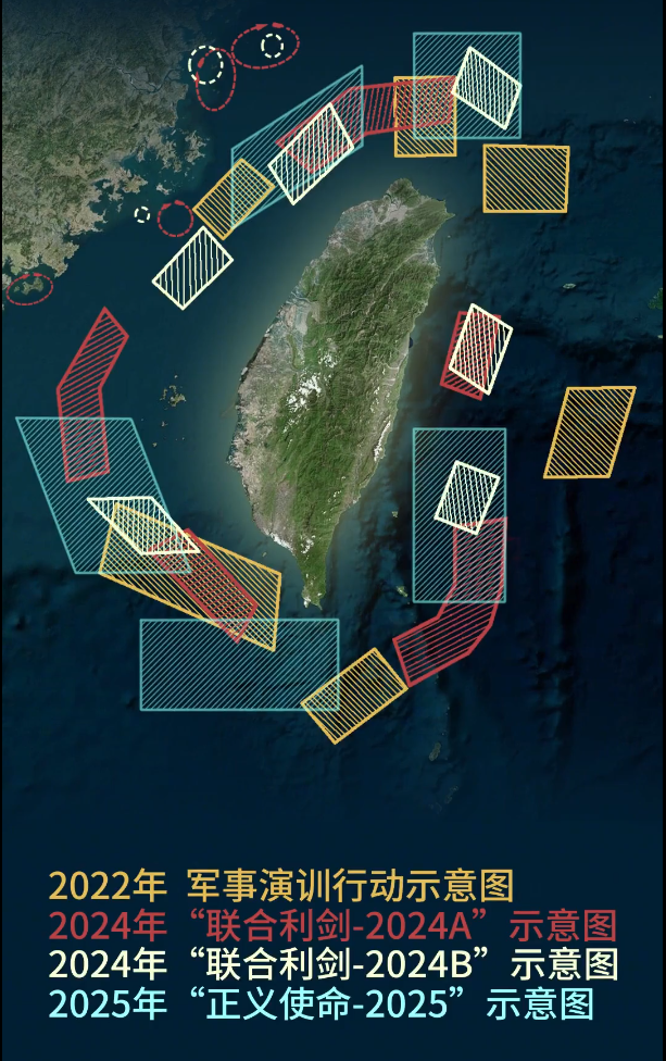 解放軍東部戰區發布“正義使命”現場演練視頻截圖 (來源:東部戰區) 相比解放軍以往進行的“聯合利劍”“海峽雷霆”等演訓活動,“正義使命”有何不同?結合當前各方公布的信息,以及軍事專家的解讀,至少可以觀察到幾點變化。 首先,強調“0幀起手”。《環球時報》引述國防大學教授張弛分析指出,與此前幾次在台海演習最大的不同,此次演習最大的特點就是“開局即打”。以往的演習通常是“漸次升級”,先展開兵力布勢,之後逐漸升級到實彈射擊。但此次演習開始不久就組織實彈射擊。參演部隊進一步把實戰的要求貫穿演習的始終,由訓轉戰,“仗怎麼打,兵就怎麼練”。 其次,圍島鏈條越勒越緊。中國軍號專門製作了視頻,展示2022年軍事演訓行動、“聯合利劍-2024A”、“聯合利劍-2024B”以及此次“正義使命-2025”的演習區域示意圖。國防大學教授孟祥青指出,解放軍艦機離台島越來越近,繩索越來越緊,對台島進逼態勢取得新突破,“台獨”生存空間被進一步擠壓。更體現出全方位、無死角、封打一體的新特點。