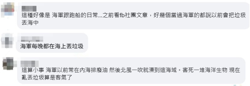 該投稿引發島內輿論關注,“中時新聞網”“風傳媒”等多家台媒援引該投稿報道時稱,這些物件證實了台軍艦出海直接往海里丟垃圾的傳聞,并批評台海軍這樣做法“太扯”,諷刺台海軍這下“糗了”“臉丟大了”。 今天(24日),台“海軍艦隊指揮部”回應稱,所屬單位未依規定妥慎處理廢棄物品,已主動聯繫地方政府全力配合後續處理事宜;另依規定檢討適處,并通令各單位引為案例宣教,防杜類情再生。 據台灣“梅花新聞網”報道,依相關規範,軍方廢棄物處理須依環保與作業程序辦理,不得任意棄置海域。然而,有多位台灣網友爆料稱,亂扔垃圾早已成為台海軍的日常陋習,船一出海就往海里扔垃圾,甚至每晚都扔。 還有網友批評稱,台海軍是海洋環境污染的慣犯,“以前常在海上排廢油,風一吹就漂到這片海域,害死一大堆海洋生物,現在亂扔垃圾,算是客氣了”。
