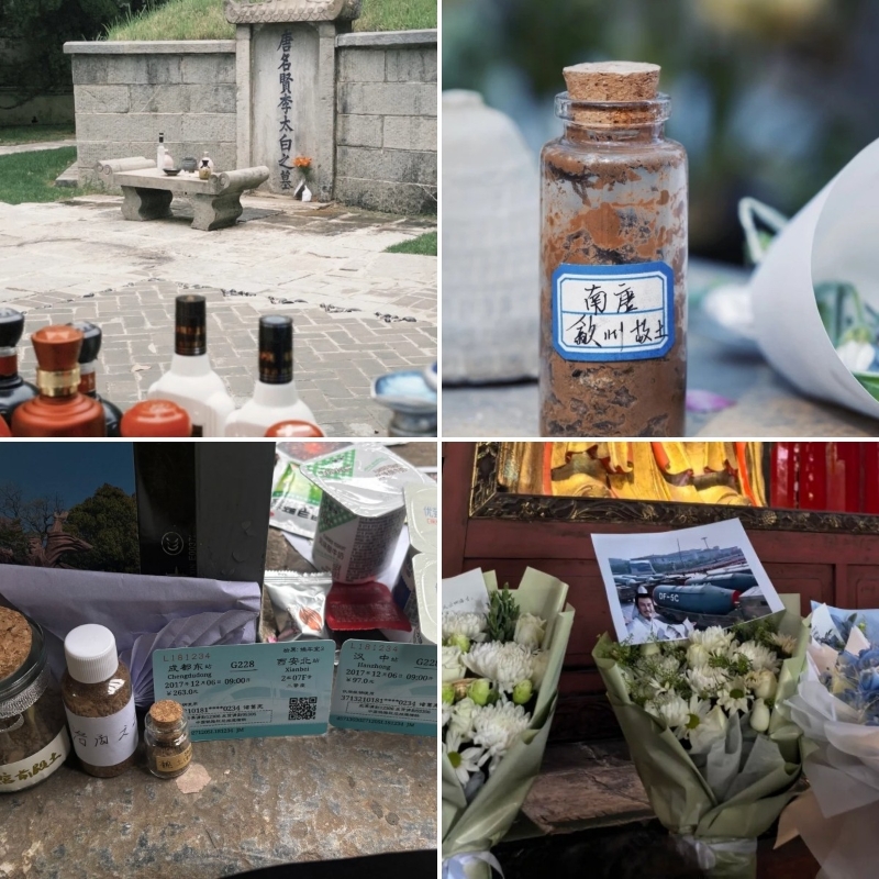 左上為李白墓前的酒,右上為李煜墓前的“南唐故土”,下方分別是武侯祠的高鐵票(左下)、東風導彈照片(右下)。圖源自小紅書