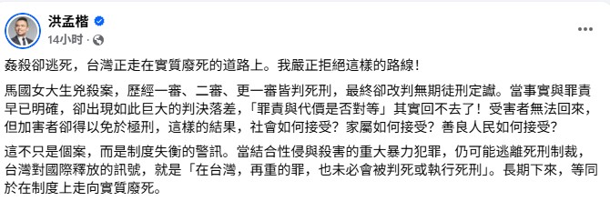 截圖自洪孟楷臉書 受害者無法回來,但加害者卻得以免於極刑,洪孟楷質問,這樣的結果,社會如何接受?家屬如何接受?善良人民如何接受? “這不只是個案,而是制度失衡的警訊。”他指出,當重大暴力犯罪,仍可能逃離死刑制裁,台灣對國際釋放的訊號,就是“在台灣,再重的罪,也未必會被判死或執行死刑”。長期下來,等同於在制度上走向實質廢死。 更諷刺的是,高達八成五以上台灣民意是反對廢死,實質廢死就是司法失信於民。洪孟楷還認為,現在問題已不只是法律條文,而是少數人能夠左右司法,失去對於“正義底線”的界定。當底線模糊,社會的不安只會擴大。不被信任的司法,才是目前台灣最大的危機。 他最後強調,無法接受如此重大罪行卻逃避死刑,更無法接受台灣一步步走向實質廢死。面對2028,他懇求國民黨候選人首要政見之一,就是“追求公平正義,拒絕實質廢死!”展現與現在執政黨截然不同的立場,讓台灣人民做出選擇與判斷。 島內網友也在其評論區指出,“廢死,是加害者的幫凶”,“真為家屬感到憤怒與無奈。”痛批“這種審判結果根本把台灣司法丟臉丟到境外去了。” (完) 【編輯:劉春】