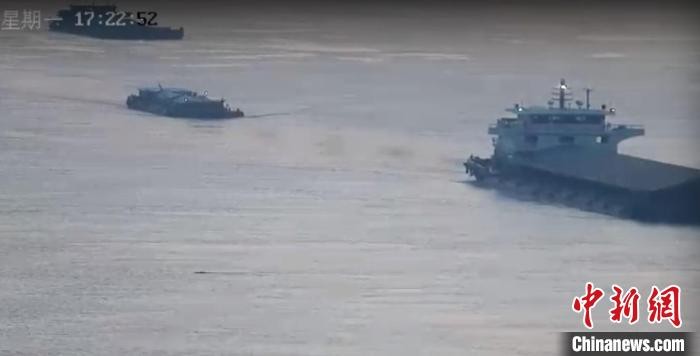 27日傍晚,南京海事局交管中心值班人員在通過長江三橋上的攝像頭例行巡查時,意外地發現江面上有一頭野豬在遊泳。江蘇海事局 供圖 工作人員將鏡頭放大後發現,這只大型動物是一頭野豬。大約12分鐘後,這只野豬成功抵達長江對岸,迅速登岸離開,消失在夜幕中。