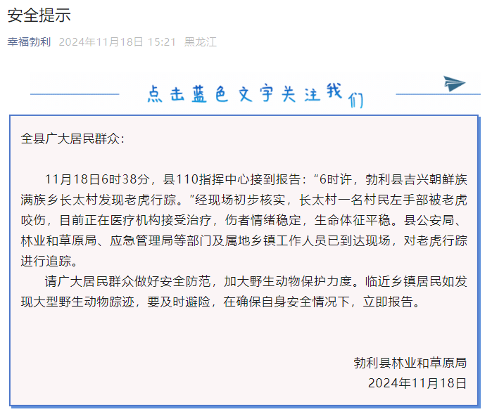 微信公眾號“幸福勃利”截圖 @央視社會與法 消息,11月18日清晨6點左右 ,黑龍江勃利,一村民在喂牛時遭一隻東北虎襲擊受傷。經醫院初步診斷,傷者多發撕脫傷,其中腕部較重,有截肢風險,目前已經轉院至佳木斯。當地警方及相關單位已前往事發地,尋覓傷人東北虎的蹤跡,并提醒村民加強防範。據當地公安部門介紹,這是勃利縣有縣誌記載以來,首次發現東北虎的蹤跡。