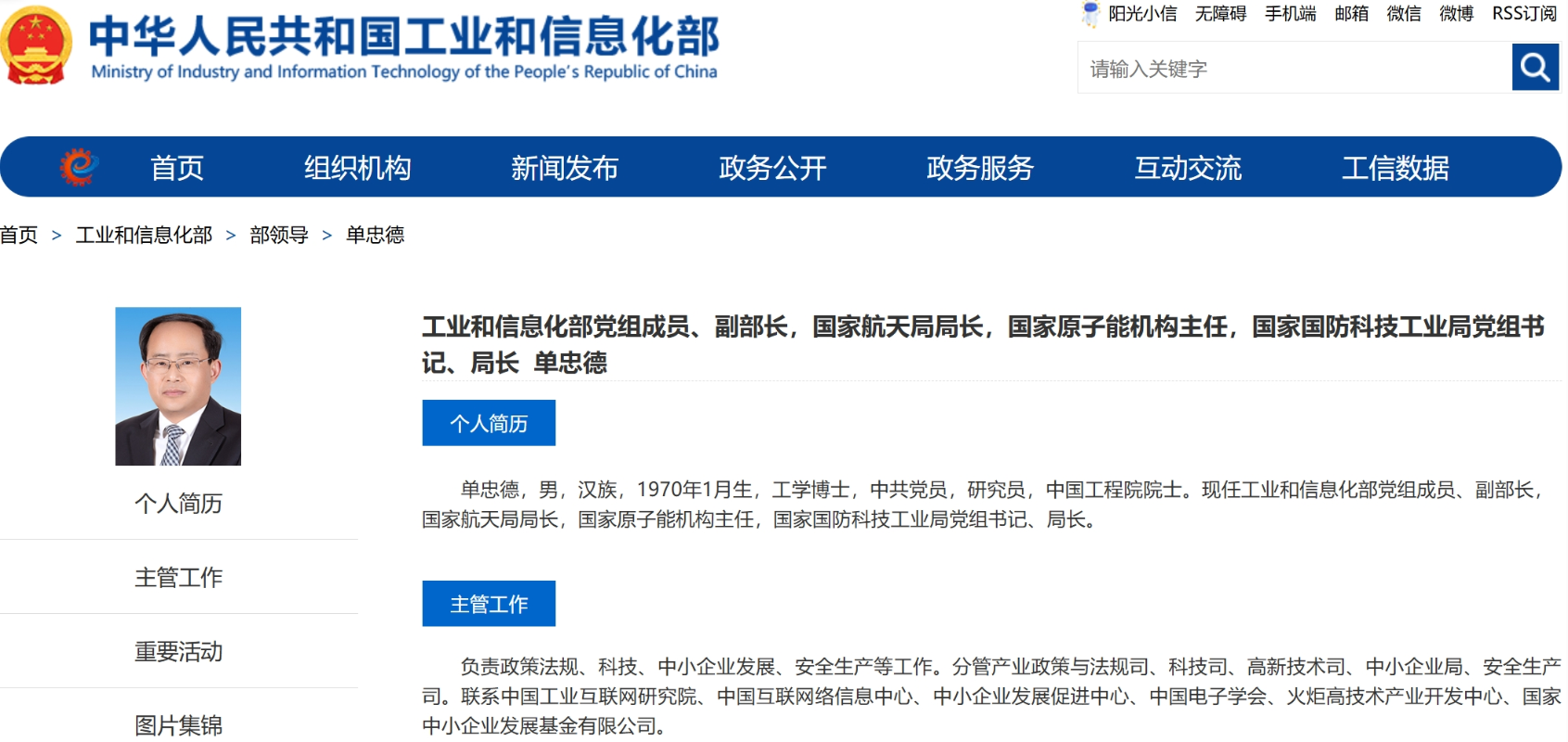 香港中通社1月9日電 據中國工信部網站近日更新顯示,工信部副部長單忠德,已兼任國家航天局局長,國家原子能機構主任,國家國防科技工業局黨組書記、局長。