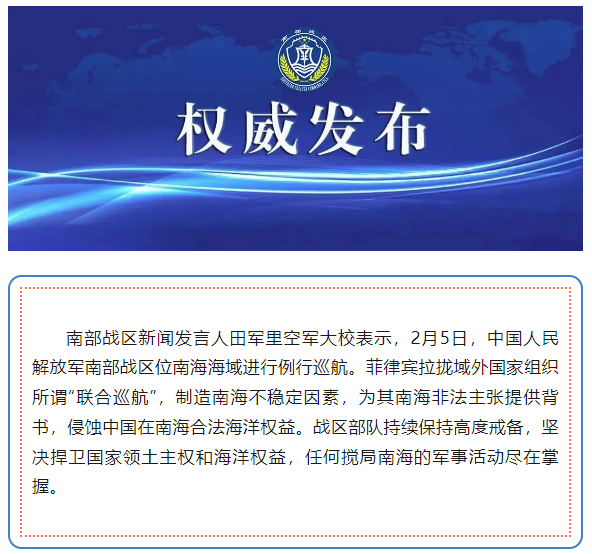 香港中通社2月5日電 中國軍方南部戰區新聞發言人田軍里空軍大校2月5日表示,當天,中國人民解放軍南部戰區位南海海域進行例行巡航。 據“南部戰區”微信公眾號消息,田軍里表示,基於菲律賓拉攏域外國家組織所謂“聯合巡航”,製造南海不穩定因素,為其南海非法主張提供背書,侵蝕中國在南海合法海洋權益。中國軍方戰區部隊持續保持高度戒備,堅決捍衛國家領土主權和海洋權益,任何攪局南海的軍事活動盡在掌握。