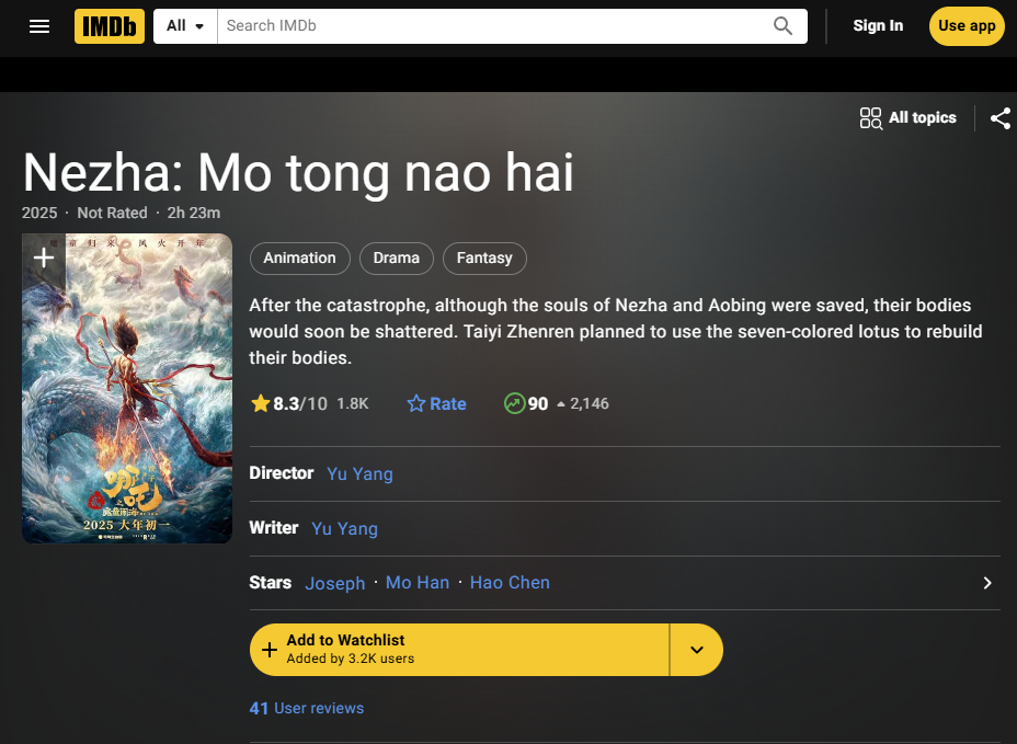 中國動畫電影《哪吒2》在海外未映先火,IMDb評分漲至8.3分享到: