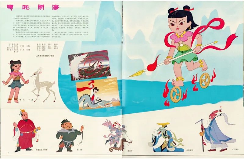 《哪吒鬧海》人物形象設計。圖自《中國銀幕》雜誌 為了凸顯人物,1979版《哪吒鬧海》導演嚴定憲,還為哪吒設計了一套融合武術與舞蹈的動作體系。例如“自刎”一幕,哪吒轉身揮劍的瞬間,鏡頭從仰角切換至俯視,白衣飄飛如蝶,配以驟停的琵琶聲,將悲壯推向極緻。