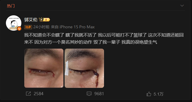 圖源:微博社交平台截圖 《新京報》19日引述郭艾倫經紀人劉偉消息稱,郭艾倫正處在術後康復階段,醫生目前無法給出具體的康復時間,“但只要是沒有大礙,他(郭艾倫)肯定還是會走上球場的”。 據郭艾倫所屬的廣州龍獅籃球俱樂部18日晚發布的傷情報告,郭艾倫是在17日的一次隊內對抗訓練中發生意外,右眼不幸受傷。俱樂部隨即啟動緊急應對預案,第一時間聯繫了中山大學中山眼科中心的國內頂尖眼科專家為郭艾倫進行手術、確保得到最好的治療。龍獅俱樂部表示,後續也將盡全力為郭艾倫的康復提供保障。 18日,郭艾倫在社交平台曬出眼睛受傷流血的照片,發文稱:“我以後可能打不了籃球了。”他還發布視頻描述說:經歷了人生中最恐懼最絕望的時刻,在對抗時被隊員用手指直接扎進了眼珠里,疼得撕心裂肺,檢查結果結膜破碎,縫了40多針。 消息曝光後,相關話題火速登頂熱搜榜,引發熱議。很多球迷都在他的社媒下留言,希望他盡快康復,重返球場。 18日深夜,微博賬號“北京眼科醫生陶勇”發布視頻,談“郭艾倫眼睛流血”一事。陶勇醫生說:“結膜受傷,經過處理後大概率會恢復得不錯,不要太憂心,祝福早日康復!”據公開資料,陶勇畢業於北京大學醫學部,係醫學博士,博士生導師、教授,首都醫科大學附屬北京朝陽醫院眼科主任醫師。(完) 【編輯:彭玉婷】