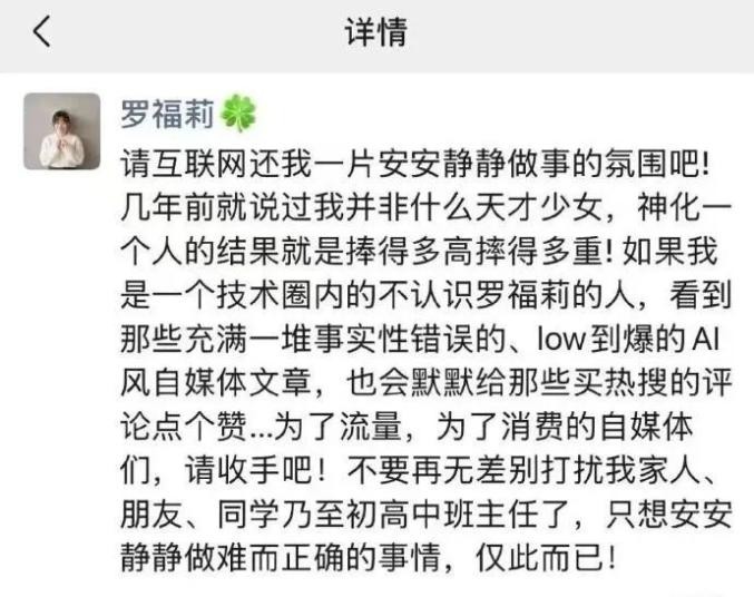 羅福莉2月18日在社交媒體上發聲 圖源:社交媒體截圖 綜合內地媒體報道,羅福莉來自四川宜賓,其高中班主任曾表示,當年羅福莉的努力和專注是出了名的,特別刻苦,目標明確。2013年,羅福莉考上北京師範大學,後保研北大。 羅福莉身上有著不少標籤:保研北大、在頂會頂刊發文章、畢業進入阿里達摩院、轉行跳槽知名私募公司、在DeepSeek從事人工智能研究、在知乎“一夜爆紅”……她也因此被網友稱為“AI才女”。 今年春節前,雷軍在直播時說,希望用千萬年薪挖角羅福莉,請她到小米帶領團隊從事AI大模型研究。此前,紅星新聞記者稱曾通過其高中班主任向她求證是否入職小米,當時她表示還在考慮要不要加入小米。 報道引述羅福莉在宜賓的一名親屬近日表示,羅福莉已到新崗位上班。“她老公在春節期間忙著開發一個新產品,所以他們春節都沒回家。”該親屬還稱,羅福莉老公的研究方向與她是同一個領域,只是細分項目不一樣。 一夜爆紅之後,羅福莉及其家人朋友都受到輿論或自媒體追捧。 羅福莉2月18日在社交媒體上發聲,表達了對自媒體熱炒的無奈,指出這樣的過度關注只會帶來更多的干擾。她坦言:“神化一個人的結果,捧得多高摔得多重!”她又呼籲為了流量、為了消費的自媒體們收手,不要再無差別打擾我家人、朋友、同學乃至初高中班主任,強調自己只想安安靜靜做“難而正確的事情”。她還強調自己並非天才少女。(完) 【編輯:彭玉婷】