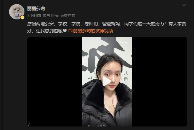 圖源:龍麗莎個人微博賬號截圖 綜合消息,中國傳媒大學一名教師透露,失聯學生龍麗莎已與家人團聚,具體情況尚不明朗。27日深夜11點左右,龍麗莎在其培訓學校的負責人協助下被找到,並通過社交媒體向大家報平安:“謝謝大家的幫助和關心,我在警方的幫助下成功和家人會合。希望大家不信謠不傳謠,我一切都好。” 27日下午,社交媒體上流傳的消息顯示,龍麗莎前往西安拍攝短劇後失聯。據其朋友透露,龍麗莎曾參加微短劇《穿越之我成了行首》的面試,並前往陝西進行拍攝工作,隨後與家人失去聯繫。網友提供的信息表明,《穿越之我成了行首》由“山藝影視文化傳媒”出品,拍攝地點設在西安。 隨著消息擴散,引起了公眾和媒體的廣泛關注。報道稱,27日晚西安相關部門確認龍麗莎並不在西安,而渭南市官方則表示已找到疑似龍麗莎的目標,但由於其位置不斷變動,警方正在全力追蹤。 山西山藝影視文化傳媒有限公司法人楊曉勛澄清,他的公司並未參與任何影視劇拍攝,主要業務為藝考培訓學校。他警告,近期有不法分子利用其公司的名義實施詐騙活動,提醒求職者提高警惕,避免遭受經濟損失。(完) 【編輯:彭玉婷】