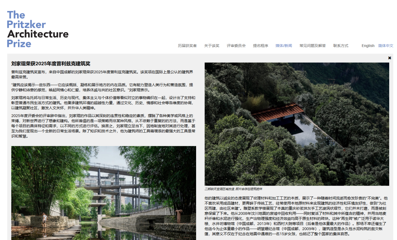 普利茲克獎官網截圖 劉家琨是普利茲克建築獎的第54位獲得者,也是繼王澍之後第二位獲此殊榮的中國建築師。2025年普利茲克建築獎評委會的評審辭中指出,劉家琨的作品以其深刻的連貫性和穩定的素質,擺脫了各種美學或風格上的束縛,對新世界進行了想象和建構。他所首倡的是一項策略而非某種風格,從不依賴於重複的方法,而是基於每個項目的具體特徵和需求,以不同的方式進行評估。換言之,劉家琨立足當下,因地制宜地對其進行處理,甚至為我們呈現出一個全新的日常生活場景。除了知識和技術之外,他為建築師的工具箱增添的最強大的工具是常識和智慧。 劉家琨於1982年畢業於重慶建築工程學院(現與重慶大學合併),後分配至成都市建築設計研究院工作。1984年至1985年在西藏工作。1987年至1989年,被借調至四川省文學院從事文學創作。1990年至1992年在新疆工作。1999年成立家琨建築設計事務所,至今仍在其家鄉四川成都生活和工作。其代表作有西村大院、鹿野苑石刻藝術博物館、重慶四川美術學院新校區設計系等。 他主持設計的作品被選送參加德中文化年、法中文化年、荷蘭NAI中國當代建築展、俄中文化年及威尼斯建築雙年展等多個國際展覽及中國國內展覽,曾獲得亞洲建協榮譽獎、2003年中國建築藝術獎、建築實錄中國獎、遠東建築獎、中國建築學會建築創作大獎。他也愛好文學,偶爾寫小說。(完) 【編輯:彭玉婷】
