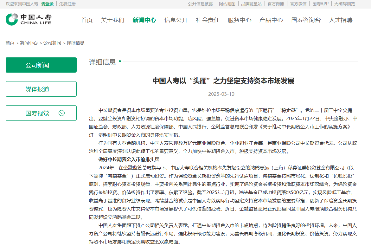 中國人壽官網截圖 據介紹,鴻鵠基金按照市場化、法制化和“長錢長投”原則,探索耐心資本投資規律,主要投向關係國計民生的重點行業。截至2025年3月初,鴻鵠基金已成功投資落地500億元,實現風險低於基準、收益高於基準的良好業績表現。 中國人壽表示,鴻鵠基金的試點是該集團以實際行動堅定支持資本市場發展的重要舉措,創新了保險資金長期投資模式,也為險資入市支持資本市場發展提供了可供借鑒的經驗。近日,中國國家金融監管總局正式批復,同意中國人壽繼續聯合相關機構共同發起設立鴻鵠基金二期。 另據《中國證券報》10日報道,今年春節前夕,中國國家金融監管總局批覆開展第二批長期投資改革試點。其中,太平洋人壽、泰康人壽、陽光人壽及相關保險資產管理公司獲准以契約制基金方式參與試點,規模為520億元。近日,中國國家金融監管總局又批覆人保壽險、中國人壽、太平人壽、新華人壽、平安人壽等5家保險公司開展長期投資改革試點,規模為600億元。截至目前,已有8家保險公司獲批開展試點,總金額1620億元。(完) 【編輯:彭玉婷】