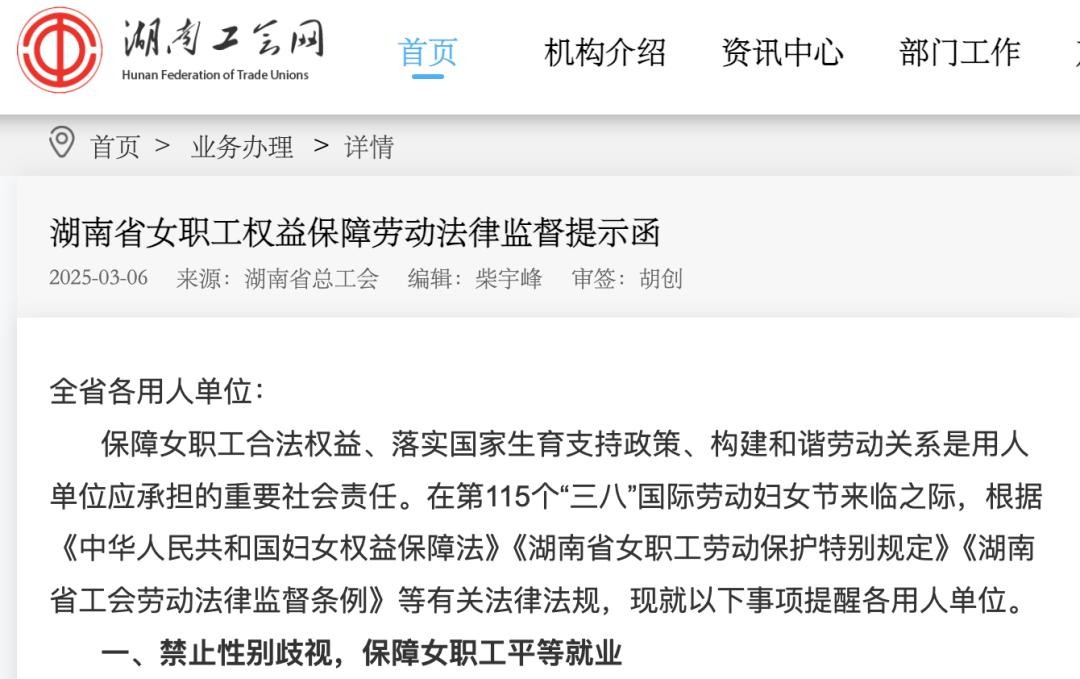 湖南省總工會發布的勞動法律監督提示函截圖 同日,青海省總工會勞動法律監督委員會發出《青海省工會勞動法律監督提示函》,提醒全省用人單位在招聘、錄用及職業發展過程中,嚴格遵守男女平等原則,除個人基本信息外,不得進一步詢問或者調查女性求職者的婚育情況;不得將限制結婚、生育或者婚姻、生育狀況作為錄(聘)用條件;不得實施其他以性別為由拒絕錄(聘)用婦女或者差別化地提高對婦女錄(聘)用標準的行為。 正值全國兩會時間,女性就業權益保障也是今年受關註的話題之一。例如,全國政協委員、民進河南省委會專職副主委朱彤暉建議,進一步完善反就業性別歧視的法律法規,明確性別歧視的界定標准和法律責任,增強法律的可操作性,加強勞動監察部門的執法力量,建立健全投訴舉報機制,方便女性維護自身權益。全國政協委員、湖北首義律師事務所主任謝文敏則建議,國家應當採取激勵措施,鼓勵企業建立生育友好的工作場所。對於在保障女性生育權利、提供靈活工作時間、支持母乳喂養等方面做得好的企業,要進行表彰和鼓勵。(完) 【編輯:胡雪石】