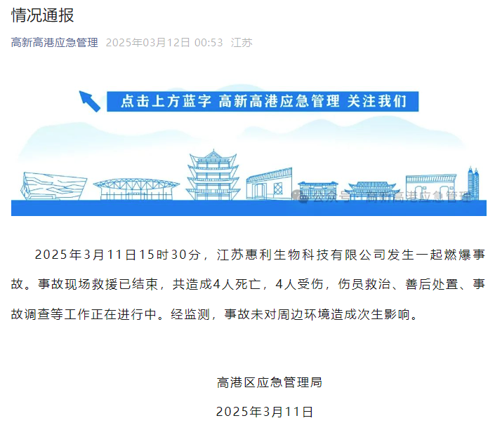 香港中通社3月12日電 中國江蘇泰州市高港區應急管理局12日凌晨通報,11日15時30分,江蘇惠利生物科技有限公司發生一起燃爆事故。事故現場救援已結束,共造成4人死亡,4人受傷,傷員救治、善後處置、事故調查等工作正在進行中。