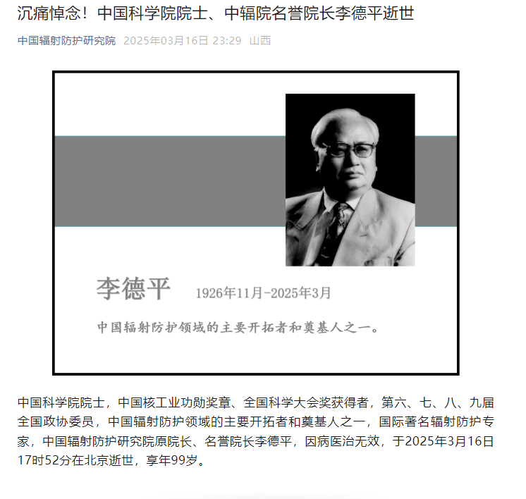 3月16日晚間,中國輻射防護研究院發佈訃告