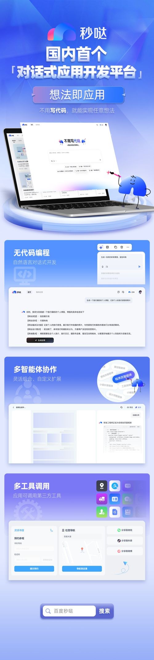 香港新聞網3月24日電 3月24日,百度宣佈國內首個“對話式”應用開發平台秒噠正式全量上線,用戶可以前往首頁體驗H5和網站開發。在去年11月的百度世界大會上,秒噠首次發佈亮相,並率先提出“多智能體協同”概念,引發行業關注,發佈即吸引超20000家企業申請內測。