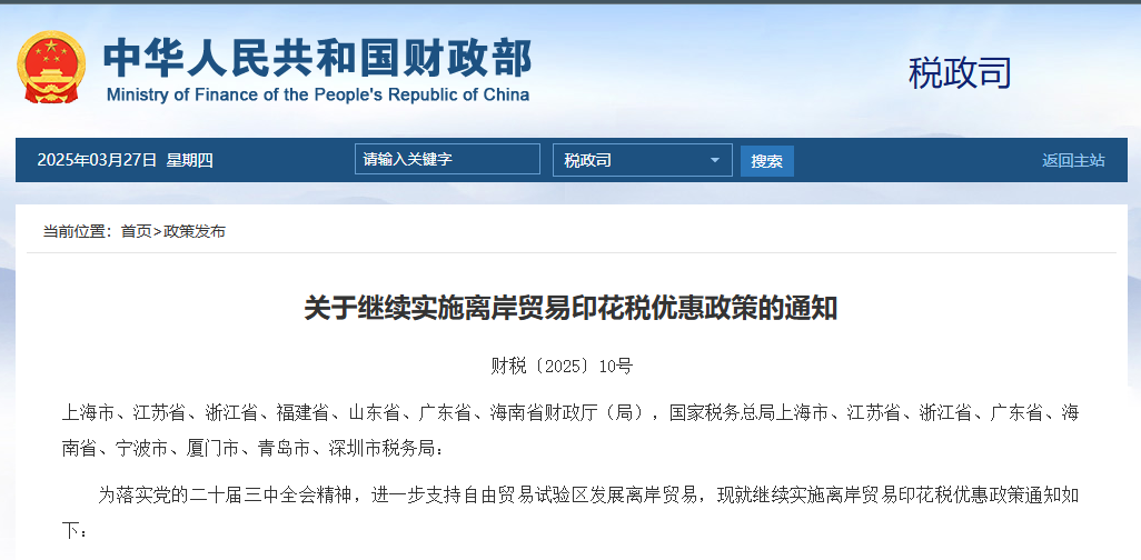 中國財政部官網截圖 通知稱,對註冊登記在中國(上海)自由貿易試驗區及臨港新片區、中國(江蘇)自由貿易試驗區蘇州片區、中國(浙江)自由貿易試驗區、中國(福建)自由貿易試驗區廈門片區、中國(山東)自由貿易試驗區青島片區、中國(廣東)自由貿易試驗區以及海南自由貿易港的企業開展離岸轉手買賣業務書立的買賣合同,免徵印花稅。 該通知所稱離岸轉手買賣,是指居民企業從非居民企業購買貨物,隨後向另一非居民企業轉售該貨物,且該貨物始終未實際進出中國關境的交易。 去年4月1日起,中國試點對註冊登記在中國(上海)自由貿易試驗區及臨港新片區的企業開展離岸轉手買賣業務書立的買賣合同,免徵印花稅。 上海《解放日報》去年4月報道,免徵離岸貿易印花稅後,企業的經營成本降低,增強了離岸貿易企業落戶發展的信心。益海嘉里金龍魚糧油食品股份有限公司稅務總監付鐵表示,受益於離岸轉手買賣合同免徵印花稅優惠政策,企業預計一年就能享受稅收優惠800萬元人民幣左右。(完) 【編輯:彭玉婷】