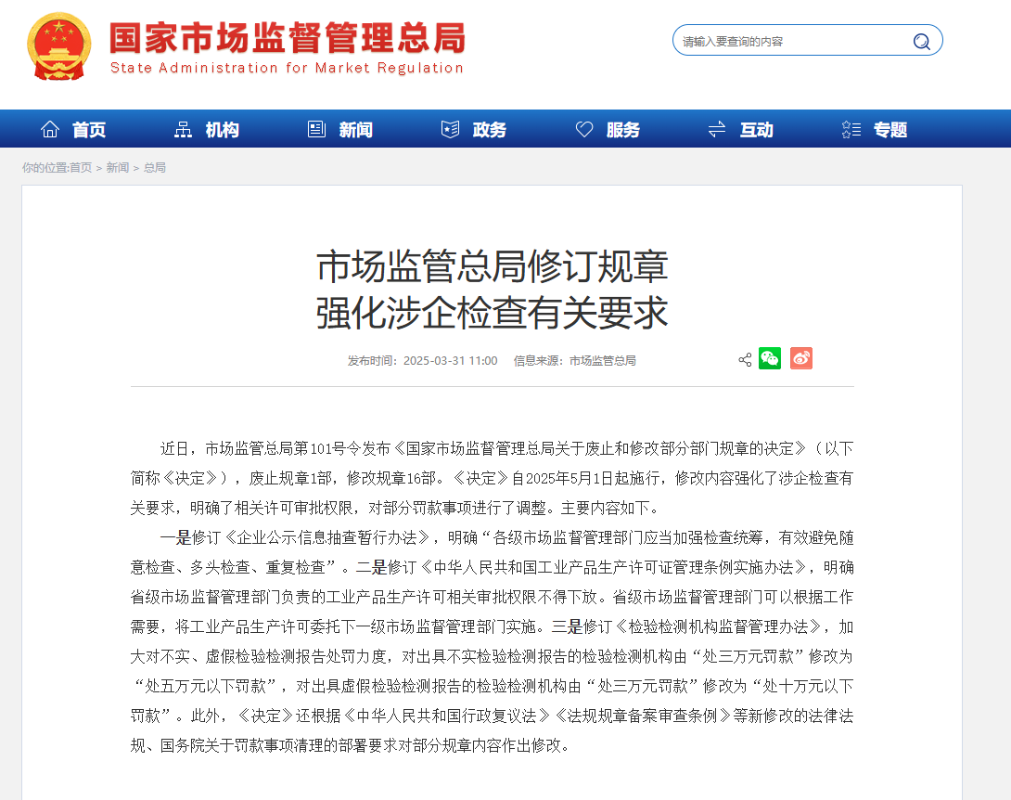 中國市場監管總局官網截圖 據市說新語微信公眾號3月31日消息,《決定》涉及廢止1部規章及修改16部現行規章。並對《企業公示信息抽查暫行辦法》進行了修訂,明確規定各級市場監督管理部門應當加強檢查統籌工作,以有效避免隨意檢查、多頭檢查以及重複檢查的情況發生,這對於減少企業負擔具有積極意義。 其次,《中華人民共和國工業產品生產許可證管理條例實施辦法》也得到了修訂。根據新的規定,省級市場監督管理部門負責的工業產品生產許可相關審批權限不得下放,但允許省級部門根據實際需要將許可工作的具體執行委託給下一級市場監督管理部門。 此外,《檢驗檢測機構監督管理辦法》在此次修訂中加大了對不實或虛假檢驗檢測報告的處罰力度。針對出具不實檢驗檢測報告的行為,罰款額度從原先的3萬元(人民幣,下同)提升至5萬元以下;而出具虛假檢驗檢測報告的罰款則由3萬元增至10萬元以下,顯著提高了違法成本。 分析認為,這些變更反映了政府進一步優化營商環境,同時保護消費者權益的決心。(完) 【編輯:彭玉婷】