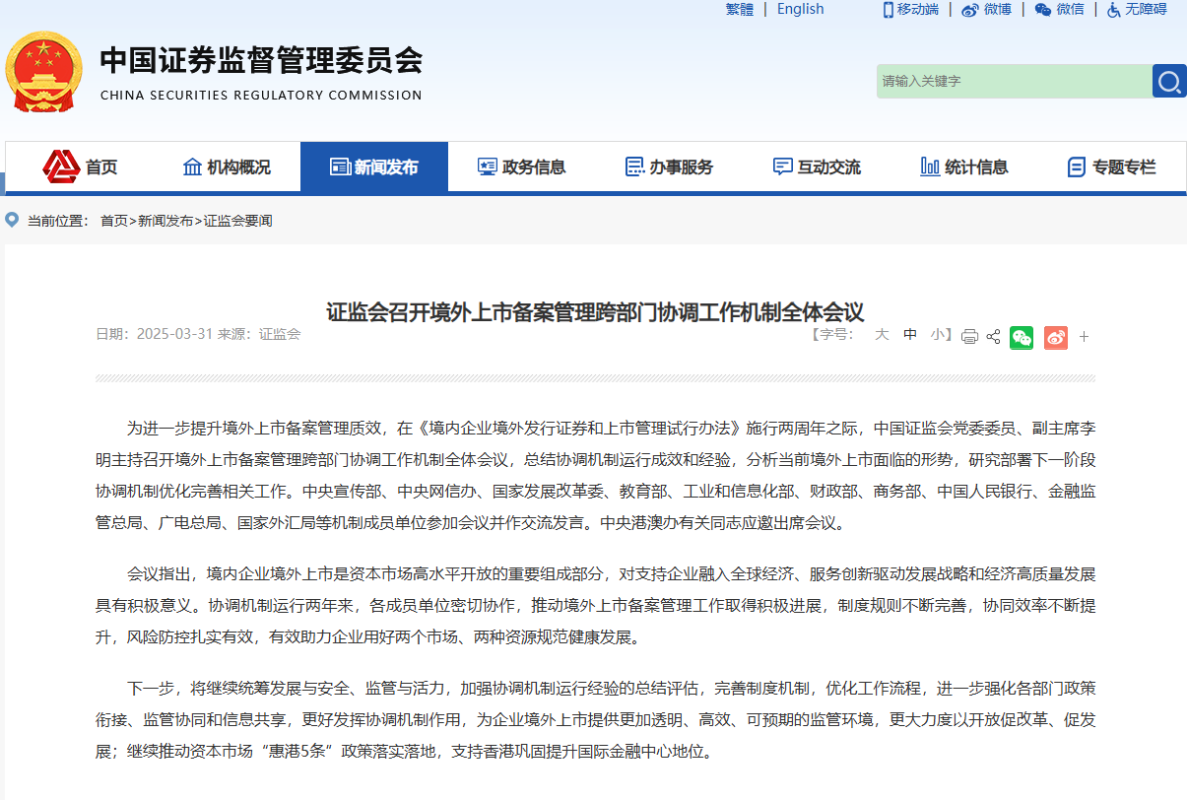 中國證監會黨委委員、副主席李明主持召開境外上市備案管理跨部門協調工作機制全體會議。圖源:證監會官網截圖 據中國證監會3月31日消息,為進一步提升境外上市備案管理質效,在《境內企業境外發行證券和上市管理試行辦法》施行兩周年之際,中國證監會黨委委員、副主席李明主持召開境外上市備案管理跨部門協調工作機制全體會議。 會議指出,中國境內企業境外上市是資本市場高水平開放的重要組成部分,對支持企業融入全球經濟、服務創新驅動發展戰略和經濟高質量發展具有積極意義。協調機制運行兩年來,各成員單位密切協作,推動境外上市備案管理工作取得積極進展,制度規則不斷完善,協同效率不斷提升,風險防控扎實有效,有效助力企業用好兩個市場、兩種資源規範健康發展。下一步,將繼續統籌發展與安全、監管與活力,加強協調機制運行經驗的總結評估,完善制度機制,優化工作流程,進一步強化各部門政策銜接、監管協同和信息共享,更好發揮協調機制作用,為企業境外上市提供更加透明、高效、可預期的監管環境,更大力度以開放促改革、促發展;繼續推動資本市場“惠港5條”政策落實落地,支持香港鞏固提升國際金融中心地位。 去年4月,中國證監會發布5項資本市場對港合作措施(簡稱“惠港五條”)。一是放寬滬深港通下股票ETF合資格產品範圍;二是將REITs納入滬深港通;三是支持人民幣股票交易櫃台納入港股通;四是優化基金互認安排;五是支持內地行業龍頭企業赴香港上市。 今年以來,香港資本市場積極向好,港股漲幅全球第一。前2個月共有41家內地企業遞交上市申請,同比增長超2倍。(完) 【編輯:彭玉婷】