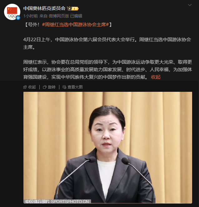 “中國奧林匹克委員會”微博賬號截圖 據中國奧林匹克委員會當天消息,周繼紅表示,協會要在中國國家體育總局黨組的領導下,為中國游泳運動爭取更大光榮、取得更好成績,以游泳事業的高質量發展助力國家發展、時代進步、人民幸福,為加強體育強國建設,實現中華民族偉大復興的中國夢作出新的貢獻。 此前據中國國家體育總局網站3月26日消息,免去周繼紅的游泳運動管理中心主任、國家跳水隊領隊職務,按國家有關規定辦理退休手續。 公開資料顯示,周繼紅1965年1月生於湖北武漢。1984年洛杉磯奧運會,原定參賽的選手呂偉受傷,周繼紅替補獲得參賽資格。時年19歲的她抓住機會,最終以435.51分奪得洛杉磯奧運會女子10米跳台金牌,成為中國跳水歷史上首位奧運冠軍。2020年1月11日,中國跳水協會在北京正式成立,周繼紅當選為中國跳水協會主席。2021年6月5日,周繼紅當選國際泳聯副主席,成為國際泳聯歷史上第一位女性副主席。 周繼紅掌舵中國跳水20餘年,培養奧運冠軍、世界冠軍數十名,在奧運會、世錦賽等賽事幾乎實現金牌包攬,將中國跳水隊打造成為名副其實的“夢之隊”。(完) 【編輯:彭玉婷】