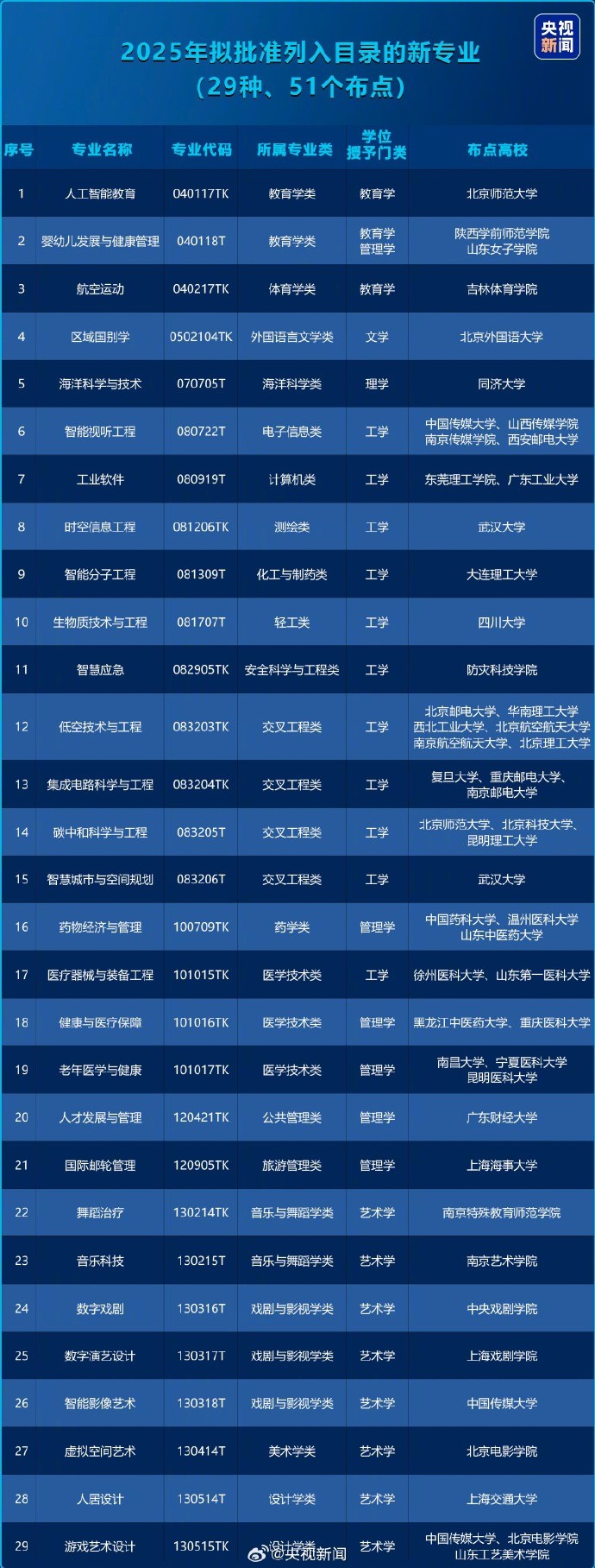 圖自央視新聞 其中,在服務國家戰略方面,增設了區域國別學、碳中和科學與工程、海洋科學與技術、健康與醫療保障等專業。 面向科技發展前沿,增設了智能分子工程、醫療器械與裝備工程、時空信息工程等專業。 主動適應市場需求,增設了國際郵輪管理、航空運動等專業。 聚焦人工智能賦能經濟社會發展,增設人工智能教育、智能視聽工程、數字戲劇等專業。 為更快響應國家戰略,中國教育部首次建立了戰略急需專業超常設置機制,對於中央最新部署、高度關注的戰略領域,開闢相關專業設置即時響應“綠色通道”。瞄準低空經濟快速發展需要,突破集中申報限制,指導北京航空航天大學等6所高校增設低空技術與工程專業。(完) 【編輯:彭玉婷】