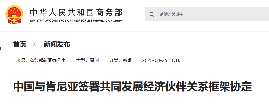 中國商務部官網截圖 據中國商務部25日消息,該框架協定規定,雙方將共同促進非洲國家製造業發展和農業轉型升級,提高非洲國家在全球市場競爭力,助力非洲更好融入全球經濟。 中國商務部表示,簽署該框架協定是落實中非合作論壇北京峰會成果的重要舉措,為中肯貿易投資合作提供長期、穩定、可預期的制度保障。 中肯於1963年12月建交。2017年5月,中肯建立全面戰略合作夥伴關係。肯是中國在非洲重要經貿合作夥伴和中非產能合作先行示範國家。中肯於1978年簽訂貿易協定,並據此建立雙邊貿易聯合委員會機制。2001年簽訂投資保護協定,2011年3月成立雙邊貿易、投資和經濟技術合作聯合委員會。肯是中國在東非第一大貿易夥伴。中國是肯第一大貿易夥伴和第一大進口來源國。(完) 【編輯:彭玉婷】