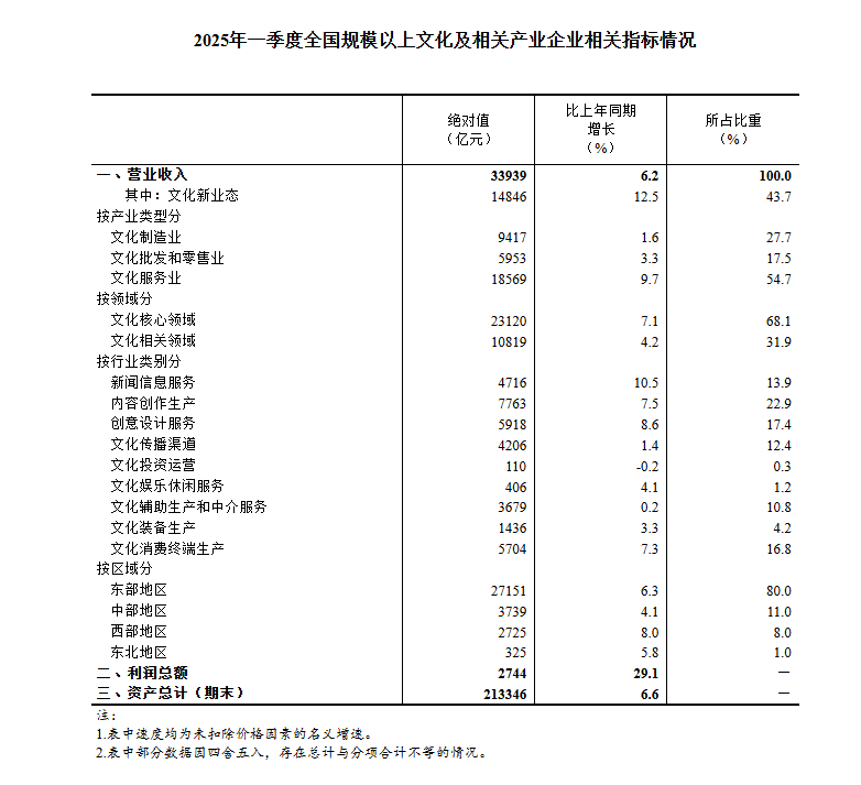 2025年一季度全國規模以上文化及相關產業企業相關指標情況。圖源:國家統計局 中國國家統計局29日公布調查結果,其中,文化新業態特徵較為明顯的16個行業小類實現營業收入14846億元,比上年同期增長12.5%,快於全部規模以上文化企業6.3個百分點。 上述新業態特徵明顯的16個行業小類是:廣播電視集成播控,互聯網搜索服務,互聯網其他信息服務,數字出版,其他文化藝術業,動漫、遊戲數字內容服務,互聯網遊戲服務,多媒體、遊戲動漫和數字出版軟件開發,增值電信文化服務,其他文化數字內容服務,互聯網廣告服務,互聯網文化娛樂平台,版權和文化軟件服務,娛樂用智能無人飛行器製造,可穿戴智能文化設備製造,其他智能文化消費設備製造。 中國國家統計局社科文司高級統計師張鵬29日解讀稱,一季度,中國文化新業態行業對全部規模以上文化企業營業收入增長的貢獻率為83.5%。其中,娛樂用智能無人飛行器製造、其他文化藝術業、其他文化數字內容服務、數字出版、互聯網廣告服務等5個行業小類營業收入同比增速較高,分別為36.8%、24.2%、23.1%、19.8%和16.4%。(完) 【編輯:彭玉婷】