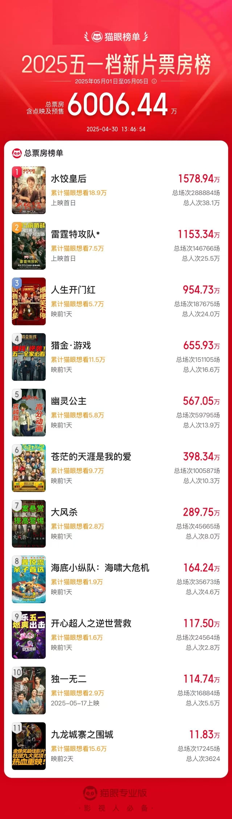2025中國五一檔新片票房破6000萬
