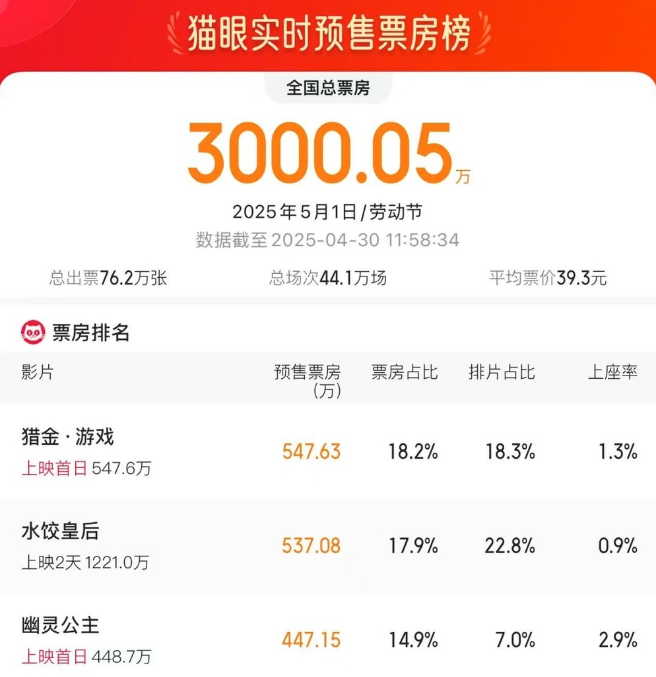此外,據央視新聞報道,截至4月30日11時58分,2025年五一檔首日電影預售票房破3000萬,《獵金·游戲》《水餃皇后》《幽靈公主》分列五一檔首日票房榜前三位。(完)
