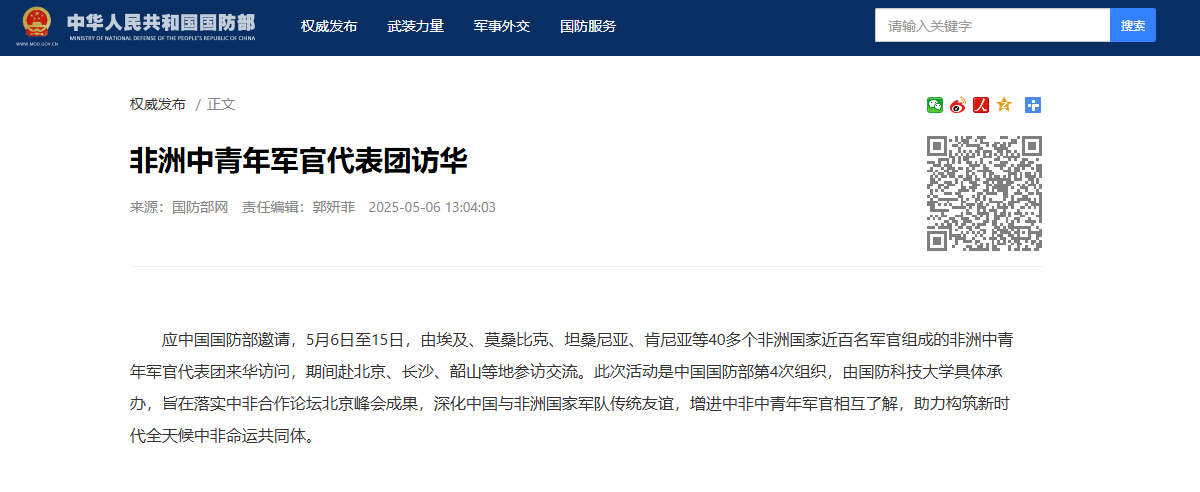 中國國防部官網截圖 此次活動是中國國防部第4次組織,由國防科技大學具體承辦,旨在落實中非合作論壇北京峰會成果,深化中國與非洲國家軍隊傳統友誼,增進中非中青年軍官相互了解,助力構築新時代全天候中非命運共同體。 去年5月,同樣有來自非洲40多個國家的80餘名中青年軍官抵達北京,開啟為期10天的訪華行程。訪問期間,非洲中青年軍官在北京、長沙、韶山、廣州、深圳等地,聽取專題講座、參觀文博景點、考察高新技術企業,並與中國中青年軍官進行深入交流。(完) 【編輯:彭玉婷】