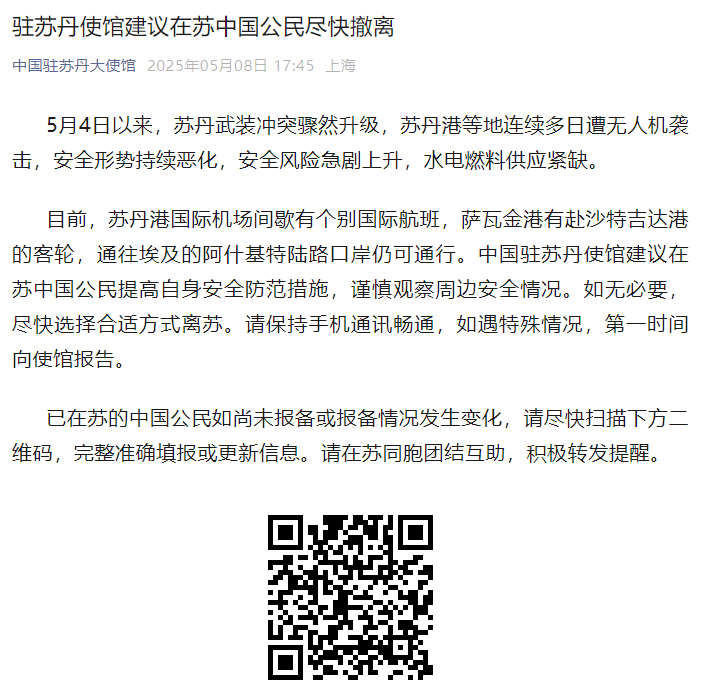 圖源:中國駐蘇丹大使館微信公眾號截圖 中使館提醒在蘇中國公民,請保持手機通訊暢通,如遇特殊情況,第一時間向使館報告。已在蘇的中國公民如尚未報備或報備情況發生變化,請盡快完整準確填報或更新信息。 據介紹,5月4日以來,蘇丹武裝衝突驟然升級,蘇丹港等地連續多日遭無人機襲擊,安全形勢持續惡化,安全風險急劇上升,水電燃料供應緊缺。目前,蘇丹港國際機場間歇有個別國際航班,薩瓦金港有赴沙特吉達港的客輪,通往埃及的阿什基特陸路口岸仍可通行。(完) 【編輯:彭玉婷】