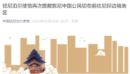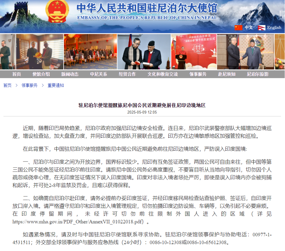 中國駐尼泊爾使館網站截圖 據“中國駐尼泊爾使館”微信公眾號消息指,近期,隨著印巴局勢趨緊,尼泊爾政府加強尼印邊境安全檢查。連日來,尼泊爾武裝警察部隊大幅增加邊境巡邏,增設檢查站,加大盤查力度,並同印度邊防部隊開展聯合巡邏。印方亦在邊境敏感地區加強管控和巡檢。 在此背景下,中使館提醒旅尼中國公民近期應避免前往尼印邊境地區,並列出兩大注意事項:一、尼泊爾與印度之間為開放邊界,國界標識較少。尼印有互免簽證政策,兩國公民可自由來往,但中國等第三國公民不能免簽證經尼泊爾前往印度。因此,旅尼中國公民務必高度重視,不要盲目聽從當地嚮導指引,或因個人疏忽或僥倖心理,在無印度簽證情況下誤入印度國境。印度對非法入境者懲處嚴厲,即使是誤入印境內亦會被拘捕和起訴,並可處2至8年監禁及罰金,且難以獲得保釋。 二、如確需自尼泊爾赴印度,務必提前辦妥印度簽證,並經印度移民局檢查站查驗護照、簽證後,自印度開放口岸入境。嚴格遵守尼泊爾和印度出入境管理規定,切勿拍攝印度邊防設施、車輛等,以免引起不必要麻煩。在印度停留期間,未經許可切勿前往限制外國人進入的區域。(完) 【編輯:馬華】