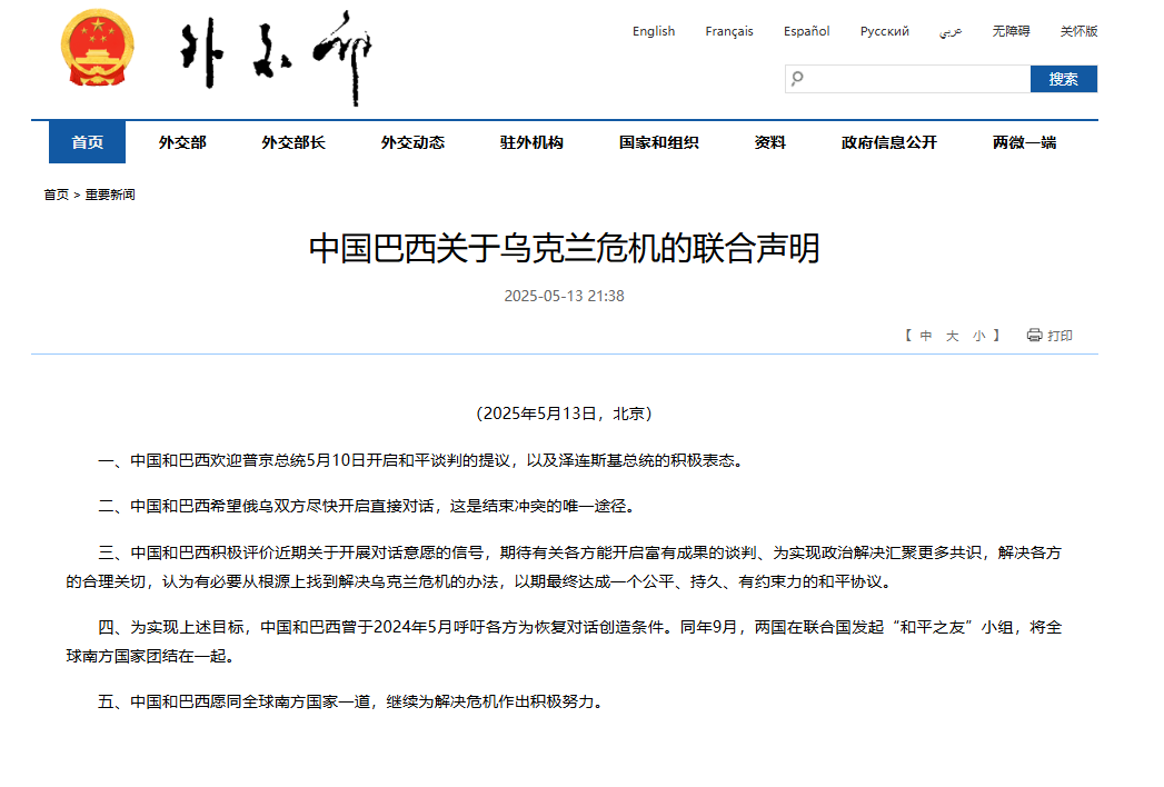 聯合聲明 圖源:中國外交部網站截圖 聲明指出,中國和巴西歡迎俄羅斯總統普京5月10日開啟和平談判的提議,以及烏克蘭總統澤連斯基的積極表態。中國和巴西積極評價近期關於開展對話意願的信號,期待有關各方能開啟富有成果的談判、為實現政治解決匯聚更多共識,解決各方的合理關切,認為有必要從根源上找到解決烏克蘭危機的辦法,以期最終達成一個公平、持久、有約束力的和平協議。 聲明表示,為實現上述目標,中國和巴西曾於2024年5月呼籲各方為恢復對話創造條件。同年9月,兩國在聯合國發起“和平之友”小組,將全球南方國家團結在一起。中國和巴西願同全球南方國家一道,繼續為解決危機作出積極努力。 據新華社消息,應中國國家主席習近平邀請,巴西聯邦共和國總統盧拉於5月10日至14日對中國進行國事訪問。中國外交部發言人林劍12日在例行記者會上表示,在當前變亂交織的國際形勢下,盧拉總統此次訪華具有重要意義。(完) 【編輯:彭玉婷】
