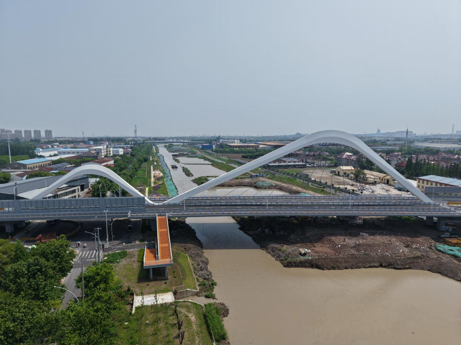 此外,羅寧路橋的張拉空間狹窄,部分區域起吊受限。團隊自主研發狹小空間張拉工裝、拱肋翻身吊耳等專用設備,解決了現場的張拉和吊裝問題,并引入橋樑實時監控系統,確保3000噸鋼結構體系在吊裝過程中和成橋後的安全穩定。 為積極響應上海市無廢工地的建設要求,羅寧路橋採用模塊化預制拼裝技術,通過工廠化預制、標準化生產、安裝模塊化提高生產效率,現場結構預制率90%以上,實現綠色建造,這在上海市水利工程配套橋樑工程中尚屬首例。
