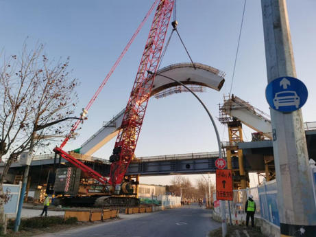 該項目是國家172項重大水利工程的重要組成部分,位於上海市寶山區,全長約1.33千米。主要施工內容包括拆除重建羅寧路橋、長虹路橋,同步新建地麵道路等附屬配套工程。 項目橋樑設計獨具匠心,雙跨系桿拱橋以巨浪狀橫跨新川沙路及新川沙河。其中,主橋羅寧路橋採用鋼箱樑全預制多節段散拼工藝,橫跨新川沙河與主幹道;另一主橋長虹路橋則以123米簡支鋼桁梁一跨過河,與羅寧路橋相互呼應。 美觀的橋樑設計背後隱藏著巨大的技術挑戰。羅寧路主橋採用非對稱連續斜拉系桿拱橋設計,在非對稱大跨徑鋼結構施工中,項目建設團隊憑藉創新思維,成功突破多重瓶頸。 針對鋼結構加工製作與安裝工藝難題,團隊通過優化設計,把構件最大寬度精準控制在7.4米,同時採用“隔一跳一、多點自平衡”拼裝工藝,配合自主設計的拱肋支架體系,完成了64吊大構件的高精度組拼,誤差控制在毫米級。
