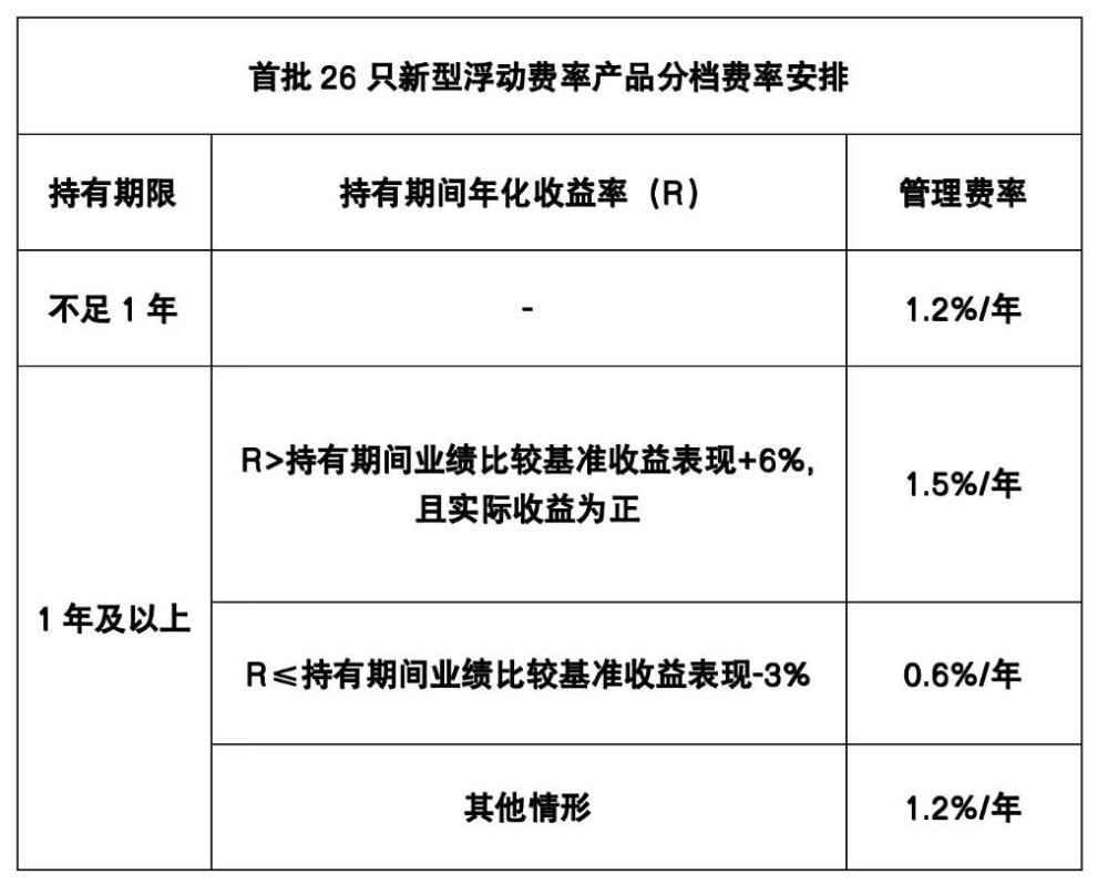 首批26只新型浮動費率產品分檔費率。圖源:新華社 據新華社報道,首批產品均設置了1.2%(基準檔)、1.5%(升檔)、0.6%(降檔)三檔費率水平。投資者持有一年以後贖回產品時,基金管理人將會根據產品年化收益水平與業績比較基準的對比情況,來計提不同檔次的管理費。 若年化收益水平基本符合同期業績比較基準的,適用基準檔費率;年化收益水平跑輸業績比較基準3%的,適用低檔費率;取得正收益且年化收益水平跑贏業績比較基準6%的,適用升檔管理費率。 若投資者在一年以內贖回產品,則不適用分檔安排,一律按基準檔費率收取管理費。 據悉,在基金經理的選擇上,各家基金公司普遍派出具有豐富市場經驗的績優基金經理管理浮動費率產品。 考慮到投資者對新型浮動費率基金的理解需要一個過程,部分基金公司表示,後續將持續做好投資者服務。通過多種方式,向投資者詳細解讀產品的費率結構、業績比較基準以及投資策略等關鍵信息。(完) 【編輯:彭玉婷】