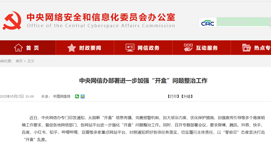 香港中通社5月27日電 據中國國家互聯網信息辦公室27日消息,近日,中央網信辦專門印發通知,督促各地網信部門、各網站平台進一步強化“開盒”問題整治工作。同時,召開專題部署會議,要求微博、騰訊、抖音、快手、百度、小紅書、知乎、嗶哩嗶哩、豆瓣等多家重點網站平台以“零容忍”態度堅決打擊“開盒”亂象。
