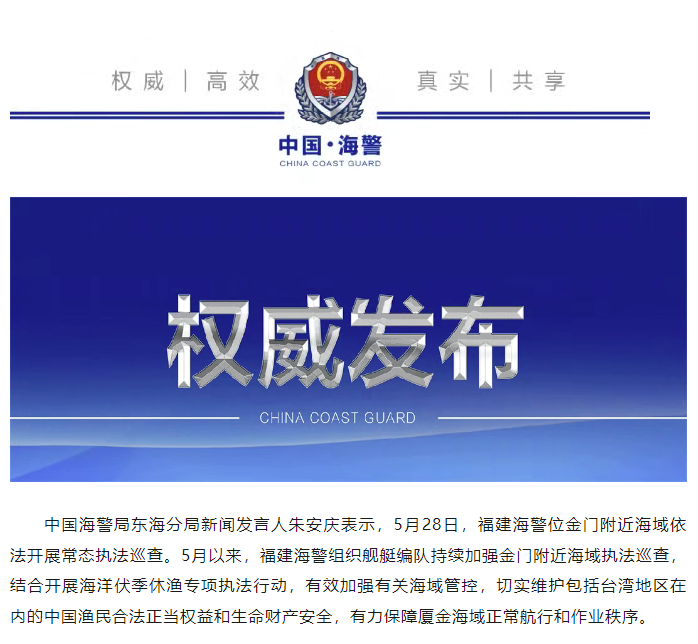 香港中通社5月28日電 中國海警局東海分局新聞發言人朱安慶28日表示,當天,福建海警位金門附近海域依法開展常態執法巡查。