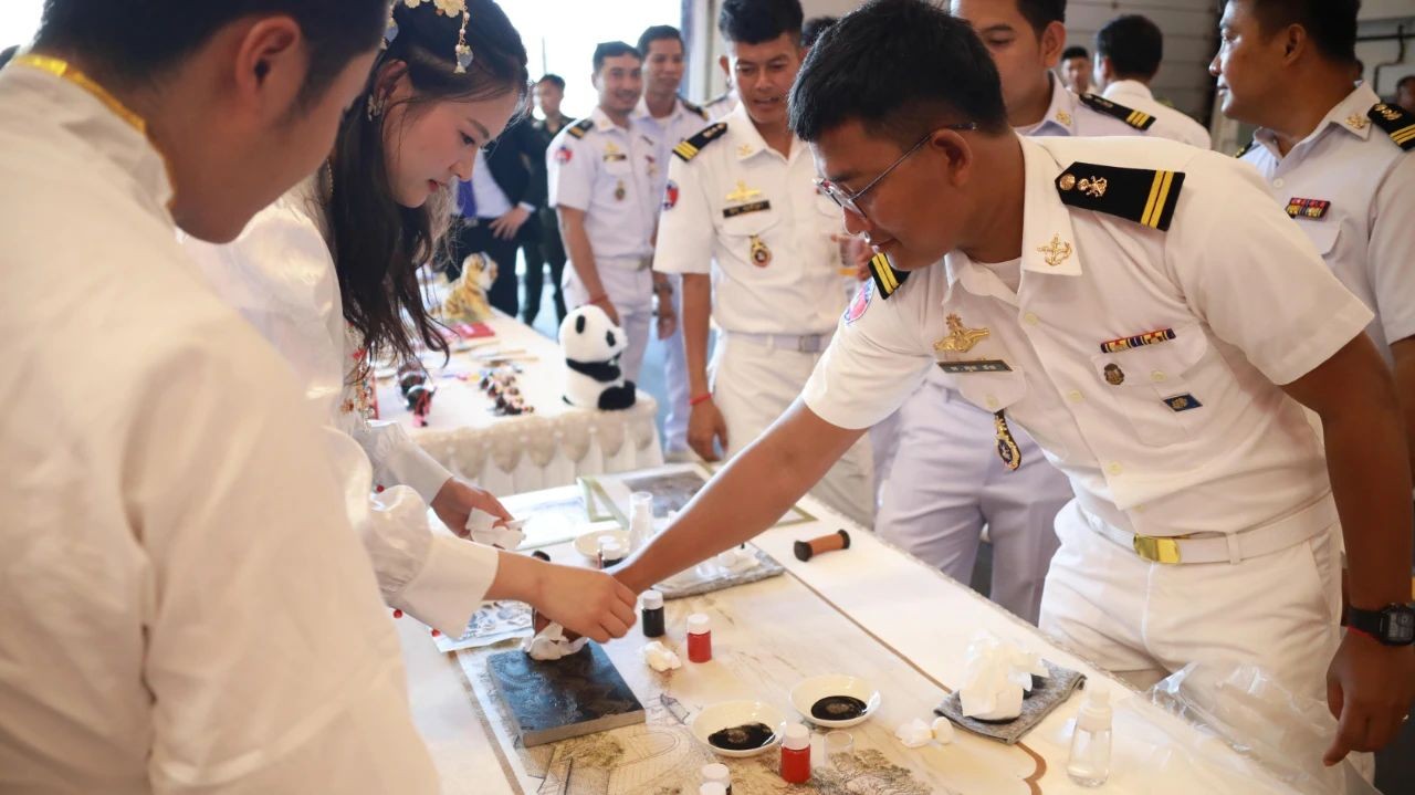 中柬“金龍-2025”聯演甲板招待會。圖源:南部戰區 據“南部戰區”微信公眾號28日消息,甲板招待會開始,柬埔寨國防部領導、聯演聯合導演部中方總導演、中國駐柬埔寨大使分別致辭,雙方參演官兵代表等200餘名嘉賓應邀出席。 當天,書法、國畫、茶藝、拓印、剪紙等中國傳統手工展示吸引嘉賓駐足觀看和體驗,多位中柬嘉賓邀請艦員寫下“中柬友誼萬歲”“中柬海軍友誼長存”等條幅,表達心中的美好祝福。