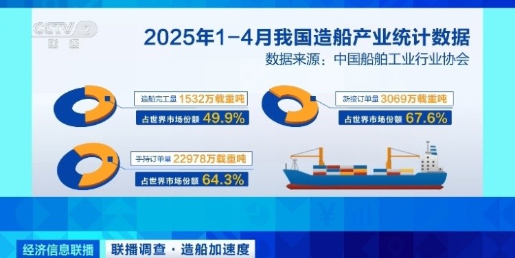 圖源:央視財經 據央視30日報道,中國船舶工業行業協會公佈的最新數據顯示,2025年1至4月,中國造船完工量、新接訂單量和手持訂單量分別達到1532萬載重噸、3069萬載重噸和22978萬載重噸,分別佔世界市場份額的49.9%、67.6%和64.3%,主要造船指標仍保持全球第一。業內人士指出,當前全球船廠產能持續處於緊平衡狀態,存量船隊周期性更新需求釋放,造船業景氣周期仍將持續。