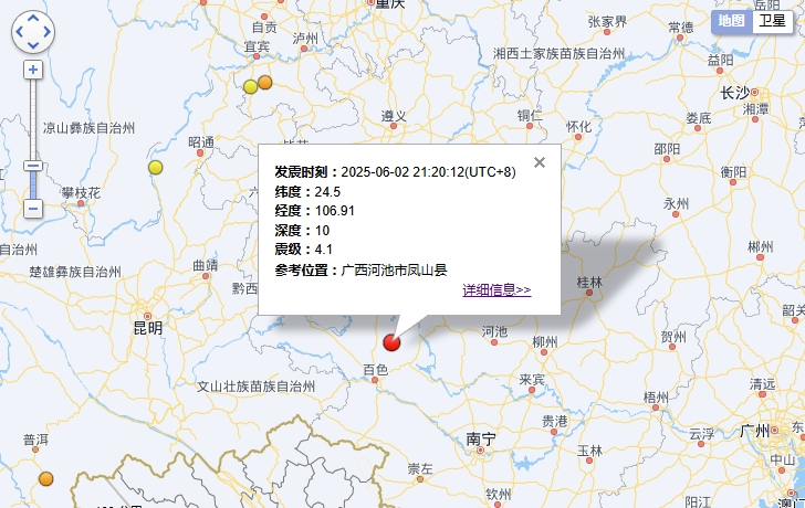 香港中通社6月3日電 中國地震台網正式測定:6月2日21時20分在廣西河池市鳳山縣(北緯24.50度,東經106.91度)發生4.1級地震,震源深度10千米。