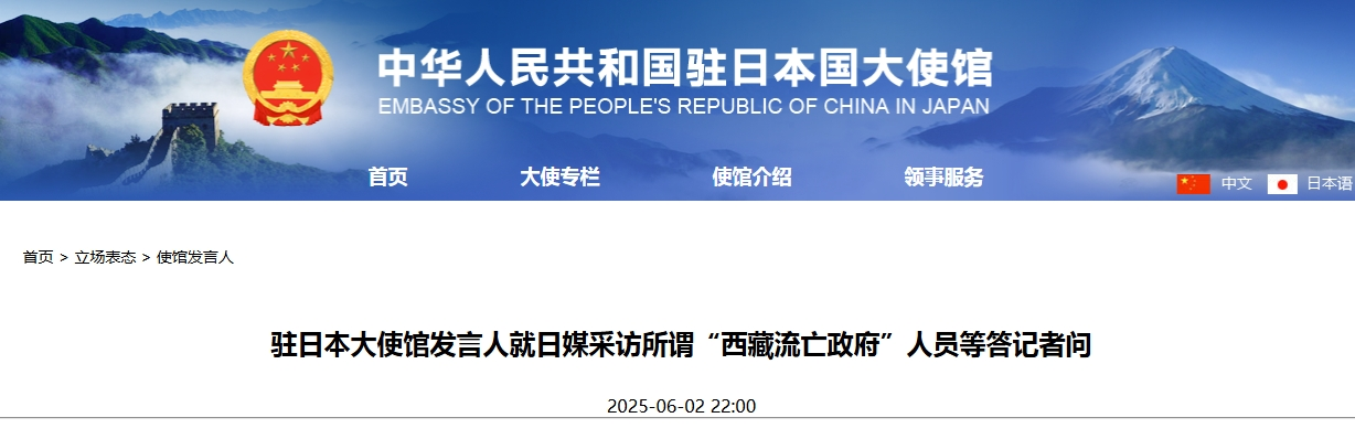 中國駐日本大使館官網截圖 中國駐日使館發言人指出,十四世達賴和所謂“西藏流亡政府”根本無權代表西藏人民,更無權決定西藏的前途命運。 發言人說,活佛轉世是藏傳佛教特有的傳承方式,有一套完整的、固定的、得到藏傳佛教界尊奉和堅持的宗教儀軌和歷史定制。所謂轉世在“自由世界”的論調純屬惡意篡改和歪曲。達賴喇嘛活佛的宗教地位和名號由中央政府確定,已經有幾百年歷史。十四世達賴本人就是按照宗教儀軌和歷史定制尋訪認定,報請當時的中央政府批准繼位的。中國政府實行宗教信仰自由政策,尊重、保護宗教傳統,依法管理宗教事務。包括達賴喇嘛在內的活佛轉世,都應當遵守國家法律、法規,遵循宗教儀軌和歷史定制。 發言人強調,西藏自古以來就是中國領土不可分割的一部分,藏族人民是中華民族大家庭的成員。西藏事務純屬中國內政,不容任何外部勢力干涉。當前,西藏經濟蓬勃發展,社會穩定,文化繁榮,人民生活不斷改善,這是有目共睹的事實。任何人任何勢力妄想通過搞亂西藏來遏制打壓中國的圖謀註定失敗。(完) 【編輯:淩玉輝】